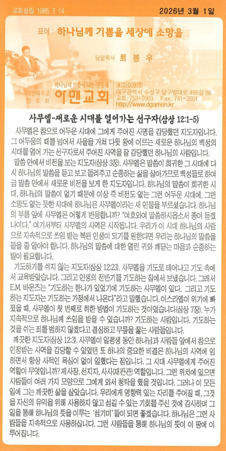 | 4 | 2026년 1월 4일, 11일 주보 | 대구아멘교회 | 2026-02-28 | 23 |