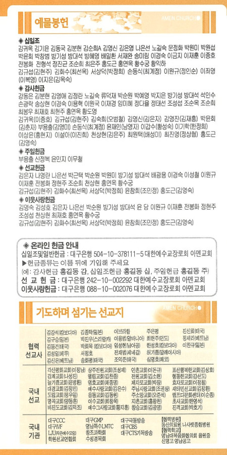 | 공지 | 아멘교회 장학부 운영규정 | 대구아멘교회 | 2026-02-28 | 19 | |