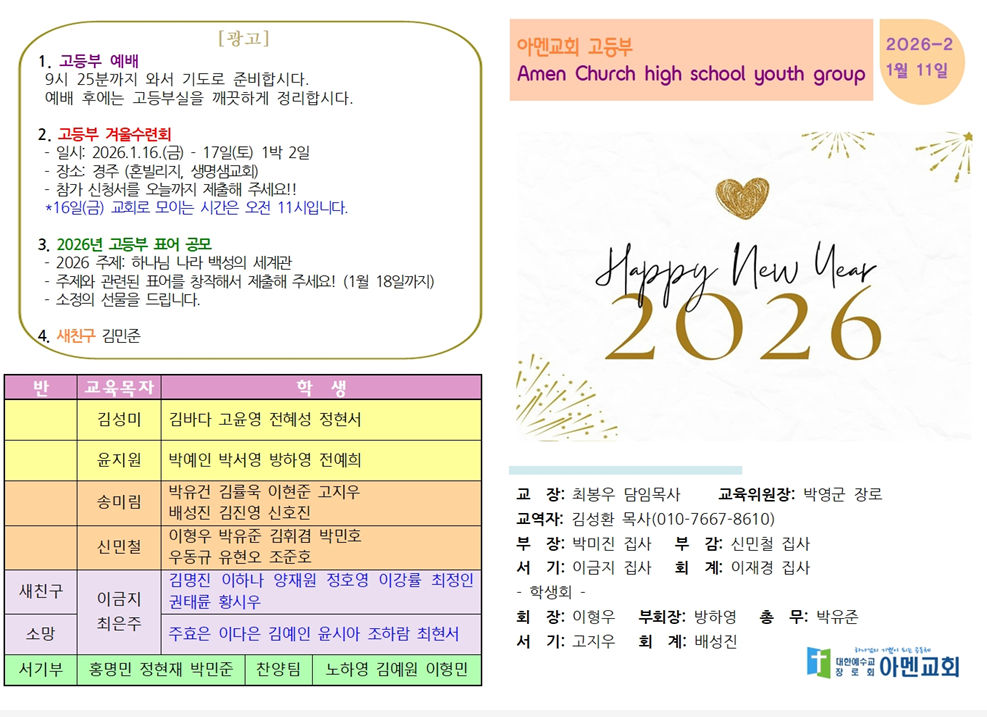 | 9 | 2026-03-01 고등부 예배 (중고등부 연합 학부모초청 개학예배) | 아멘교회 | 2026-03-08 | 17 | |