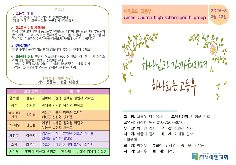 | 9 | 2026-03-01 고등부 예배 (중고등부 연합 학부모초청 개학예배) | 아멘교회 | 2026-03-08 | 17 | |