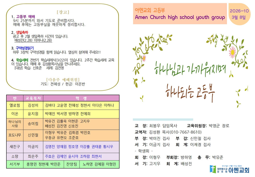 | 9 | 2026-03-01 고등부 예배 (중고등부 연합 학부모초청 개학예배) | 아멘교회 | 2026-03-08 | 17 | |