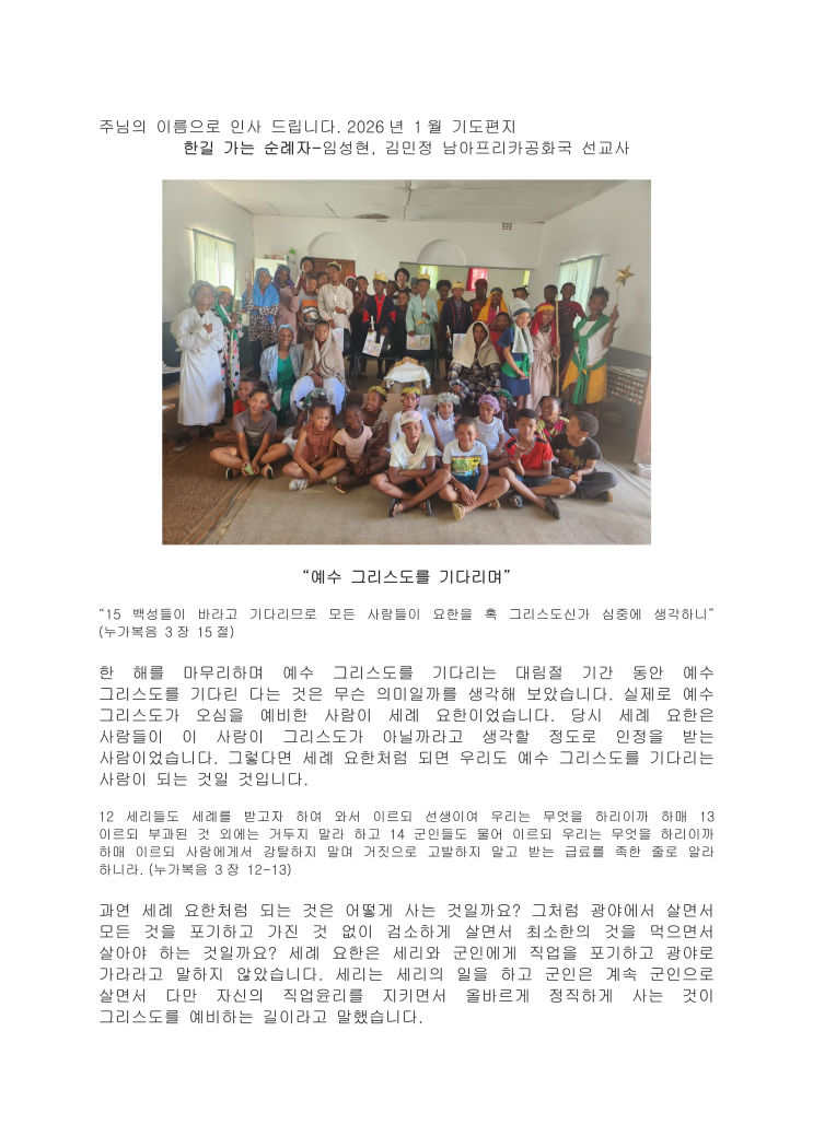 남아프리카공화국 임성현 선교사님 1월 편지