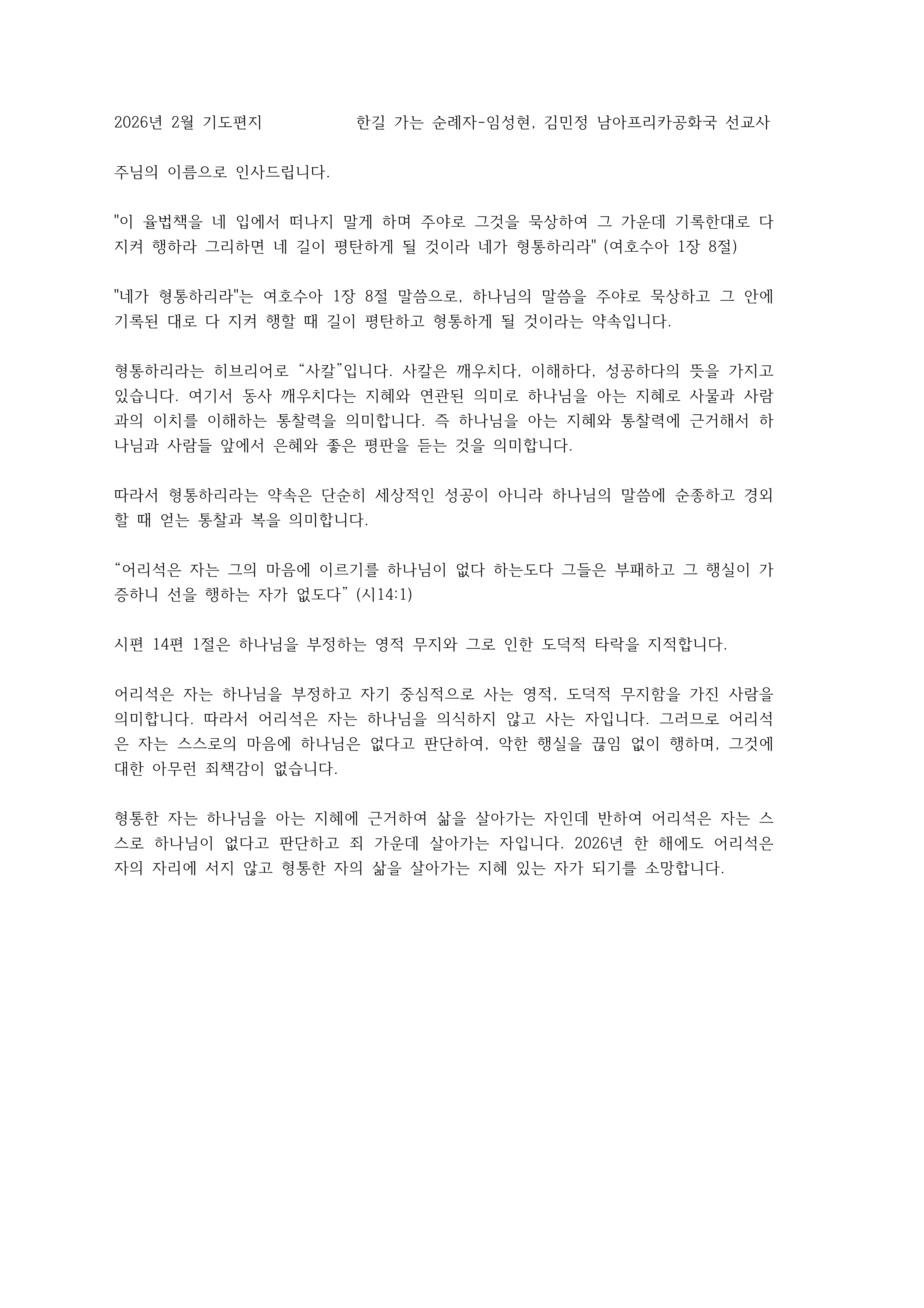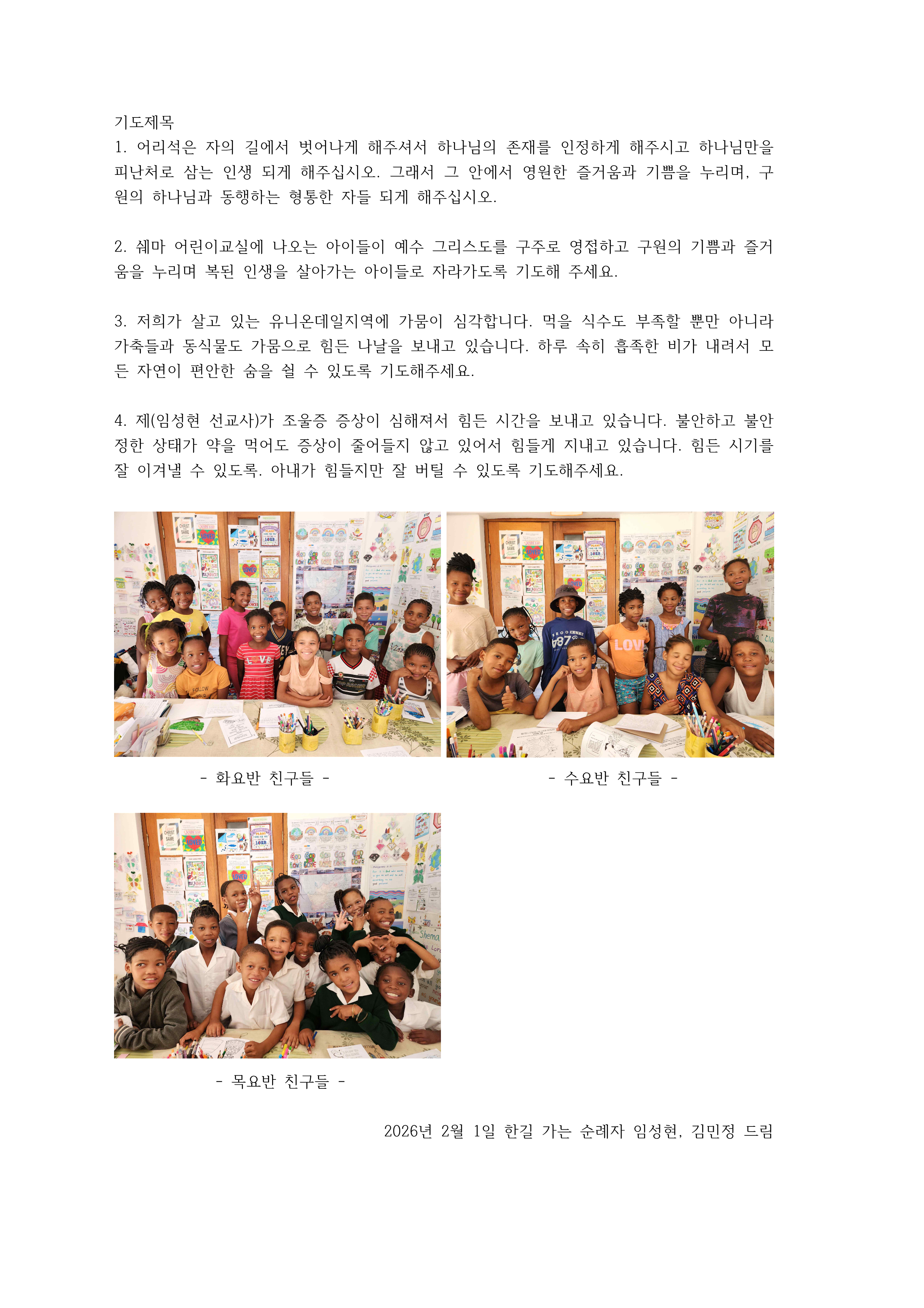 | 4 | 남아프리카공화국 임성현 선교사님 2월 편지 | 아멘교회 | 2026-03-15 | 18 | |