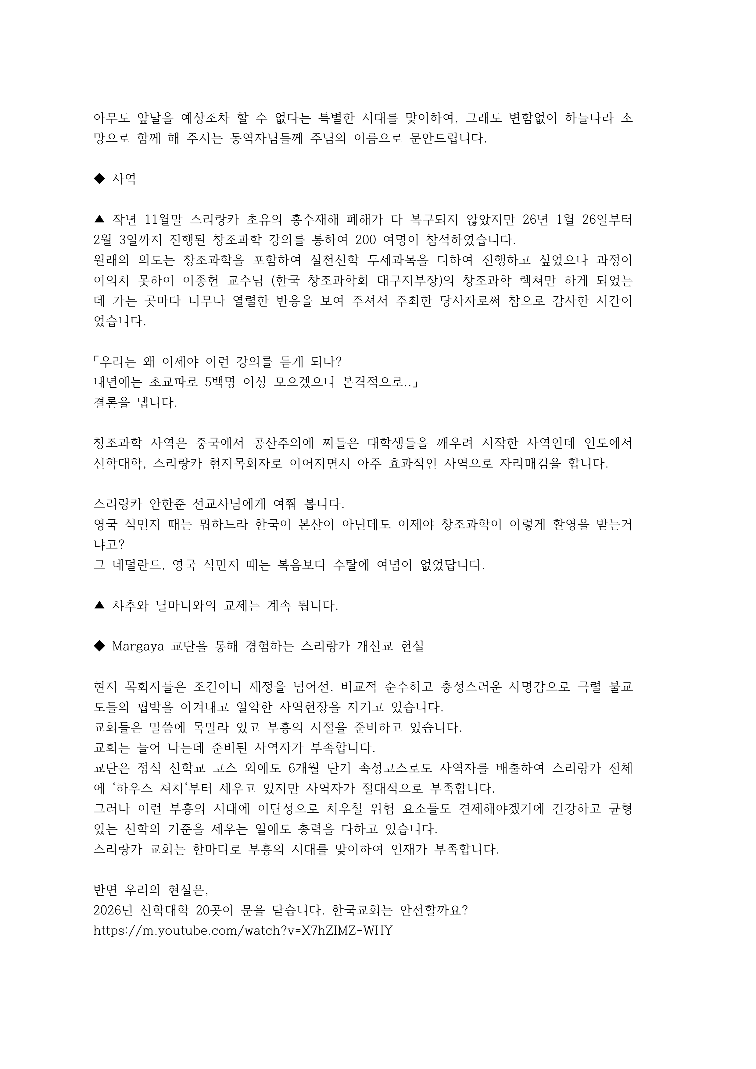 | 5 | 스리랑카 김신은 선교사님 2월 편지 | 아멘교회 | 2026-03-15 | 17 | |