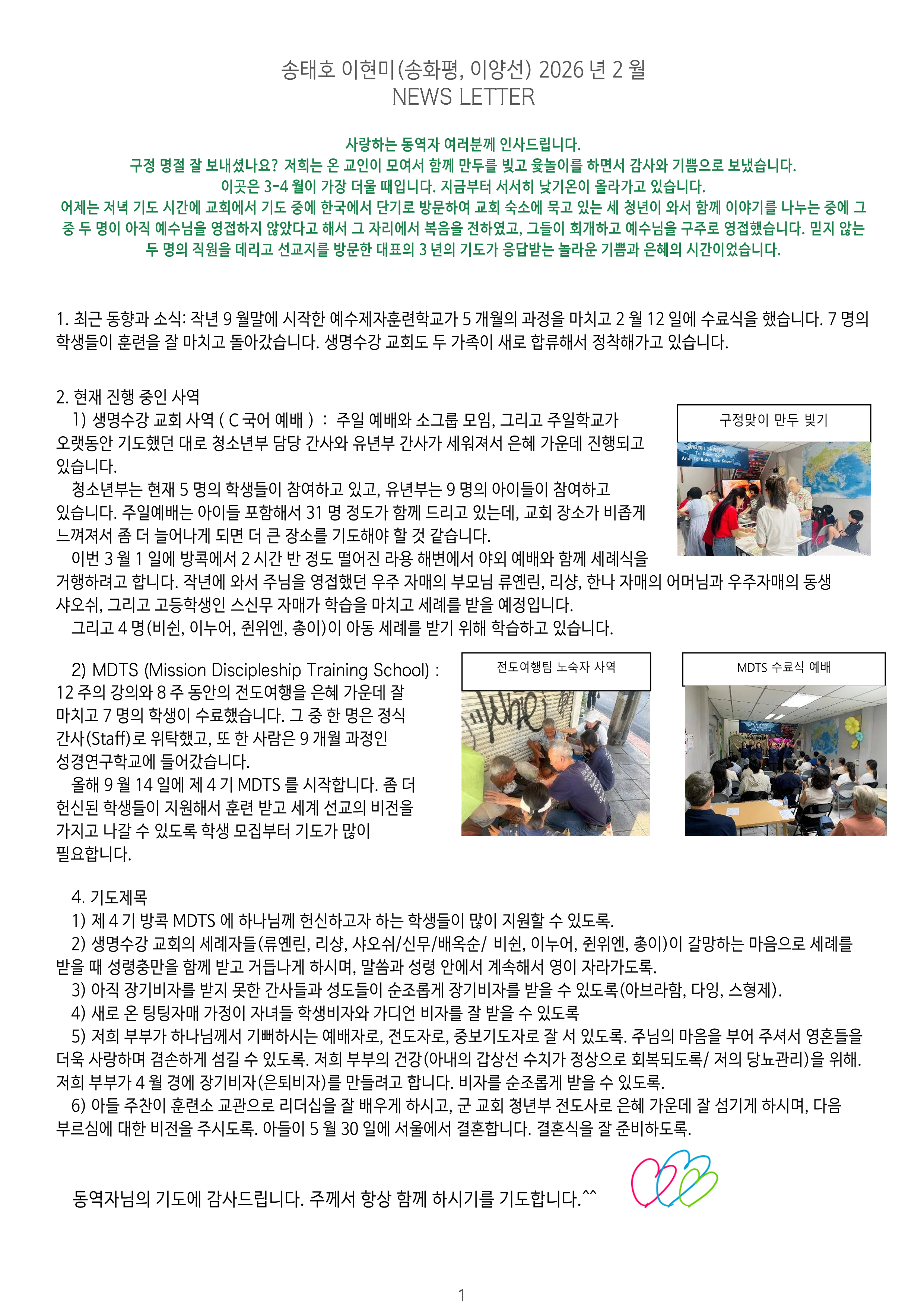 | 10 | 태국 진신희선교사님 2월 편지 | 아멘교회 | 2026-03-15 | 16 | |