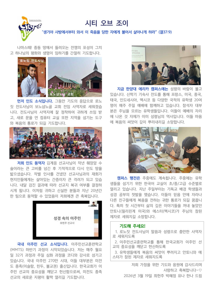 | 13 | 인도 최헌주 선교사님 3월 편지 | 김찬양 | 2026-03-20 | 15 | |