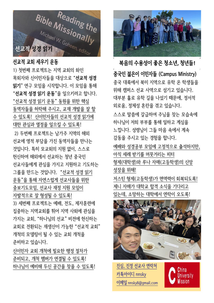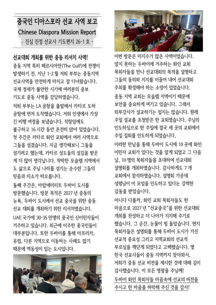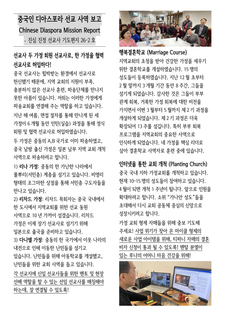| 14 | 중국 진심 진정선교사님 3월 편지 | 김찬양 | 2026-03-25 | 11 | |