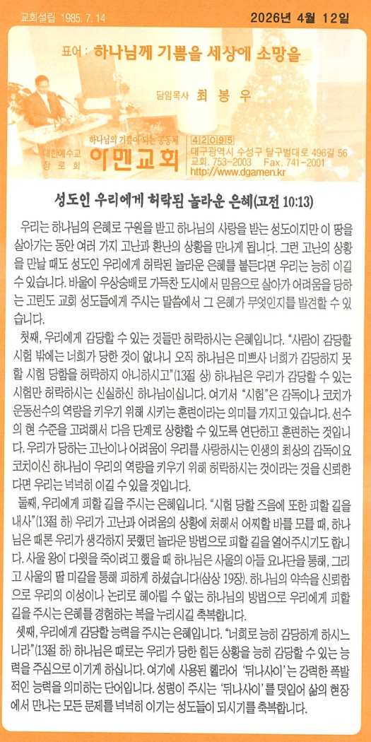 | 4 | 2026년 1월 4일, 11일 주보 | 대구아멘교회 | 2026-02-28 | 40 |
