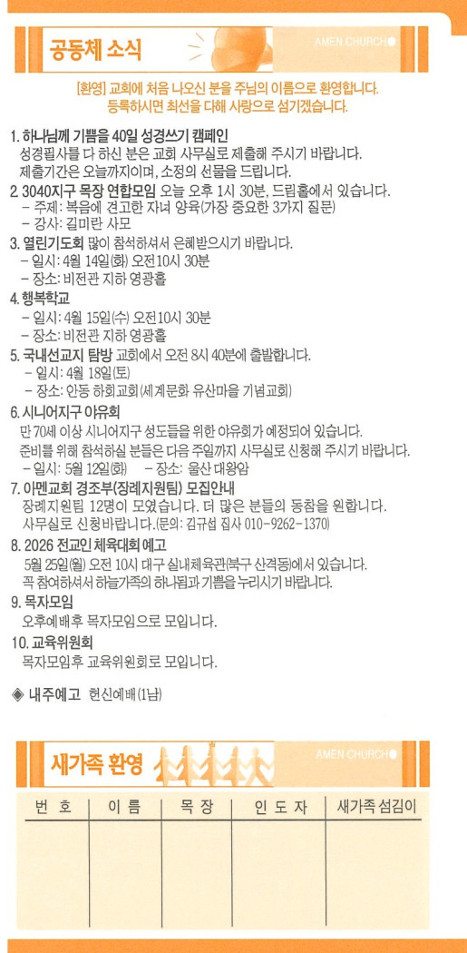 | 13 | 2026년 3월 15일 주보 | 아멘교회 | 2026-03-15 | 92 | |